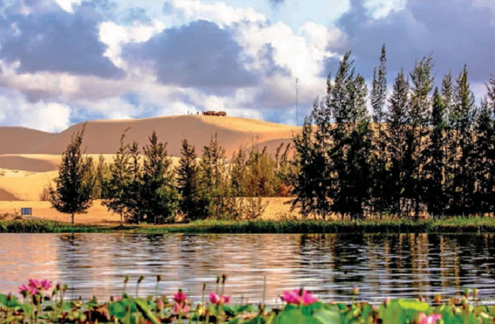 Không chỉ có cảnh quan đặc sắc, Bàu Trắng còn hấp dẫn bởi hệ sinh thái độc đáo. Trên mặt hồ, những đầm sen, súng nở hoa theo mùa, điểm xuyết sắc hồng, sắc tím giữa nền cát trắng, mang lại cảm giác thanh bình và gần gũi với thiên nhiên. Xa xa, những rặng cây bụi chịu hạn vươn mình trong nắng gió càng làm nổi bật sức sống bền bỉ của vùng đất này.